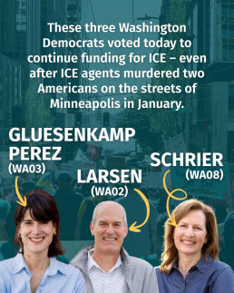 Three Democrats in Washington State — Rep. Gluesenkamp Perez (WA-3), Rep. Larsen (WA-2), and Rep. Schrier (WA-8) — voted in the House on Monday to continue funding DHS & ICE. If you’re one of their constituents, call today! We need to hold them accountable to the demands of their constituents — no more funding for ICE!