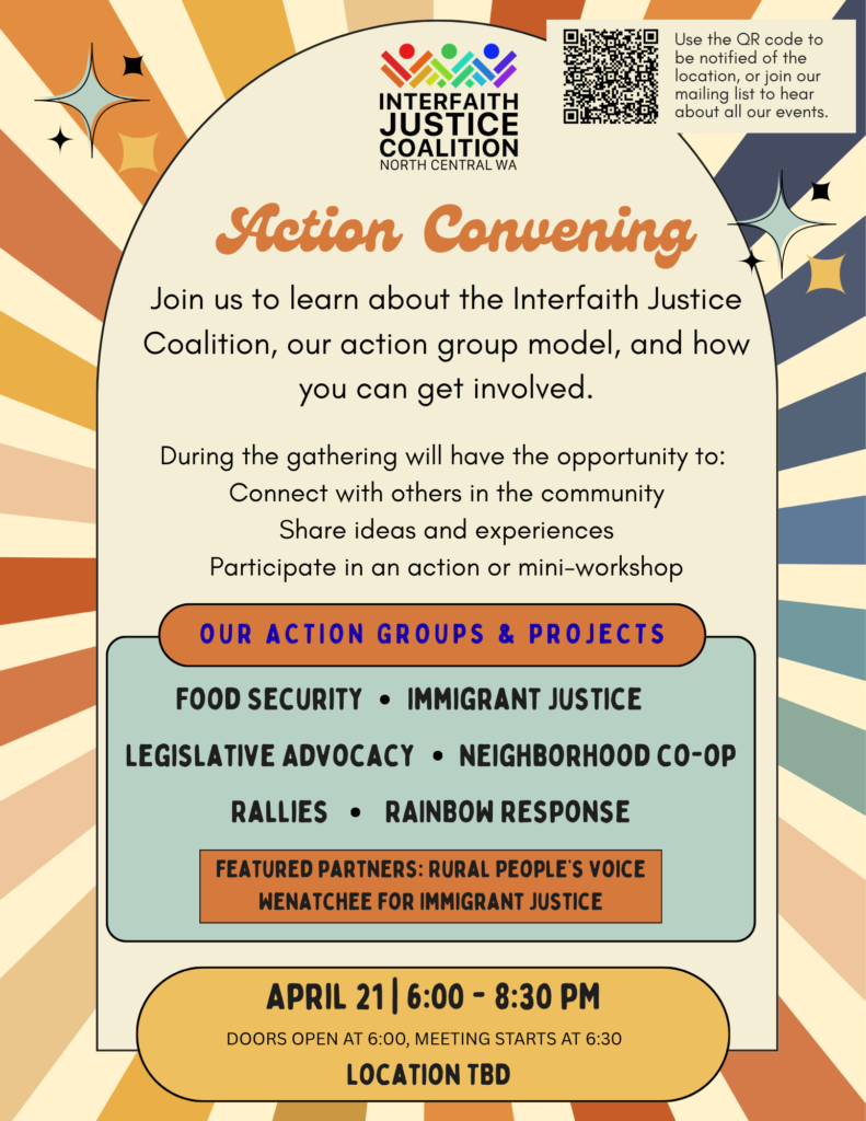 Interfaith Justice Coalition (IJC) Action Convening – April 21 (6:00-8:30 PM) at New Song Community Church in Wenatchee. Join us to learn about the IJC, our action group model, and how you can get involved. Action workshops will feature Rural People’s Voice and Wenatchee for Immigrant Justice!