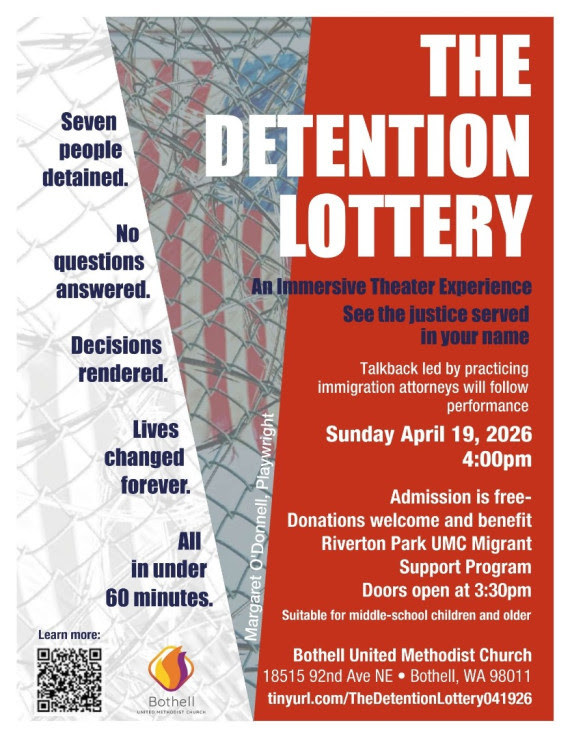 Detention Lottery, April 19, 2026, 4-6pm at Bothell United Methodist Church, 18515 92nd Ave. N.E. Bothell, WA 98011. This immersive theatre experience takes the audience into the detention center courtroom with re-enacted actual court cases followed by talkback with practicing immigration attorneys. Appropriate for middle school ages and above, childcare provided. Admission is free. Financial donations are encouraged for Riverton Park UMC Migrant Support Programs. Contact clare.taylor@comcast.net with any questions.